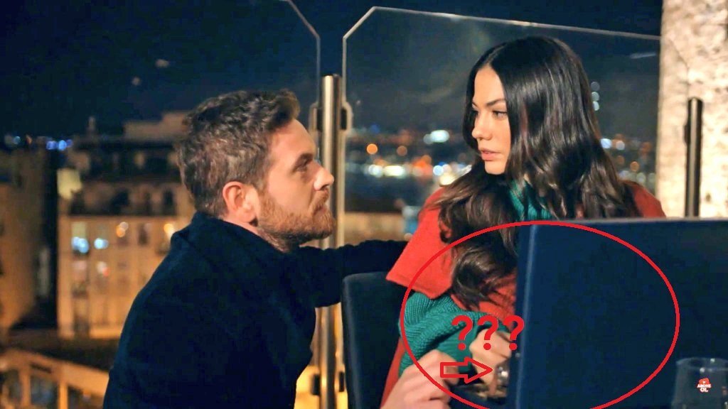 Първоначално помислих, че пред Зейнеп има отворен лаптоп, което никак не ми се връзваше с концепцията за романтично предложение за брак. Сега като се загледах обаче има една метална пластинка, така че повече ми прилича на кутия като тези плюшените за скъпи вещи (бижута, сервизи, т.н.), та ми е интересно какво е измислил Баръш бей Kissing Smiling Eyes Дано не е комплект ножове и вилици за новия дон на Нермин Laughing