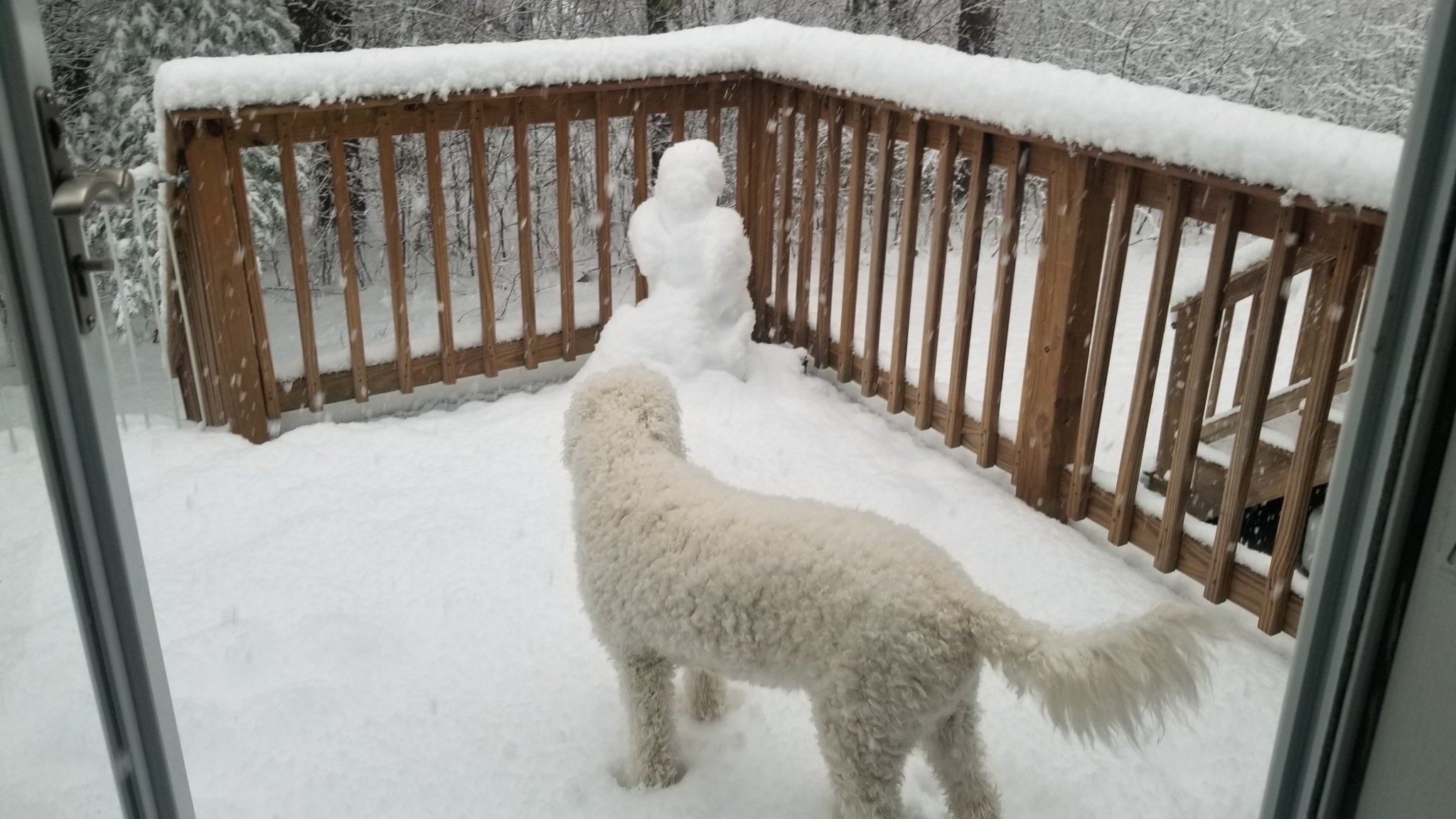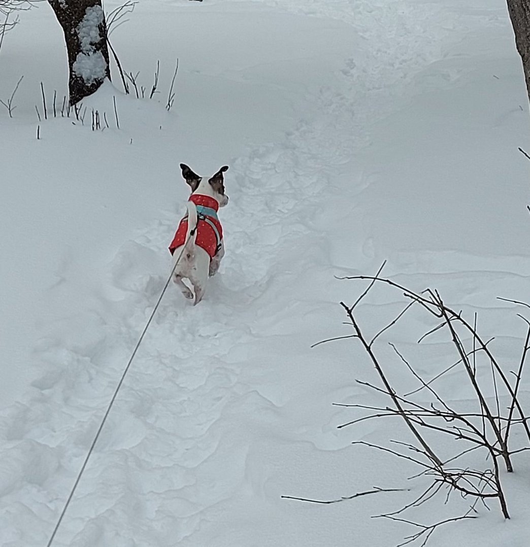 Днес на следобедната разходка ентусиазмът от снегът вече бе нулев...Така след едно кръгче наоколо, търти към входа. И точно наближихме и като заквича това ми ти куче, замрънка и почна да редува крачета. Да видите пристъпяне и на четвъртият крак.явно му се бяха смръзнали лапите. Нося го вече на ръце, а той плаче и се оплаква. На мен хем ми е смешно, хем  ми е жал. Много емоционално и изразително куче имаме...