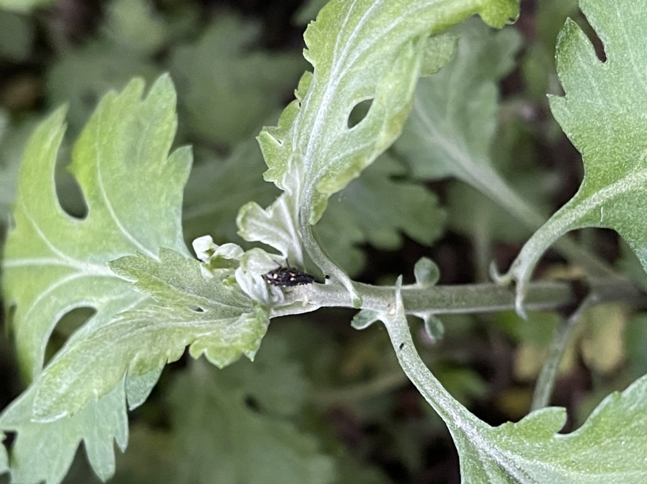 Ще видя сега. Но много тези ларви... то почерняват хризантемите от тях. Това са от тези есенните високи хризантеми, с големи рошави цветове, като иглички и розови. Бабешките.
