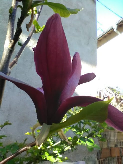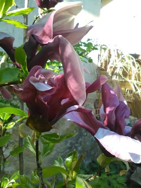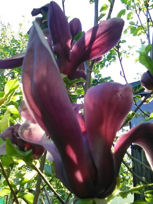 Ето я черната магнолия Nigra отблизо, за съжаление снимките не могат да предадат аромата й. През деня ухае , когато застанеш до нея, а когато си завреш носа в цвят , аромата е опияняващ. Жълтата не е с толкова силен аромат. Ако сега избирате магнолии, избирайте по-късно цъфтящ сорт. Разликата във време на цъфтеж е около 7-10 дни , но е рашаваща в случай на слани или застудяване. Жълтата ми е по-ранна и винаги е под заплаха да й бъдат попарени цветовете.