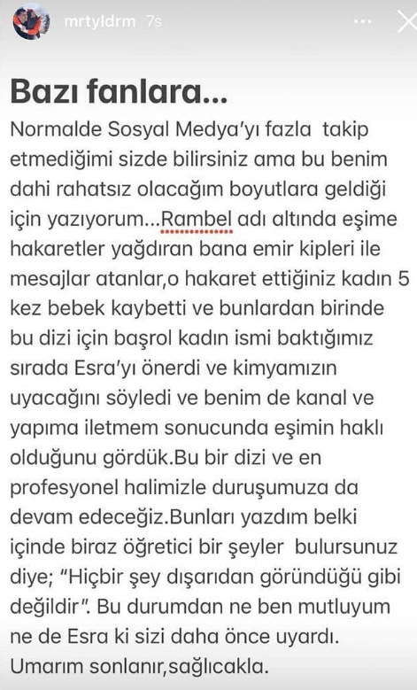 Это сериал мы будем продолжать работать как профессионалы. Я надеюсь, что вы найдёте в моих словах что-то поучительное. Не всё является таким, как выглядит со стороны. В этой ситуации ни я, ни Эсра, которая до меня предупреждала также, не счастливы.