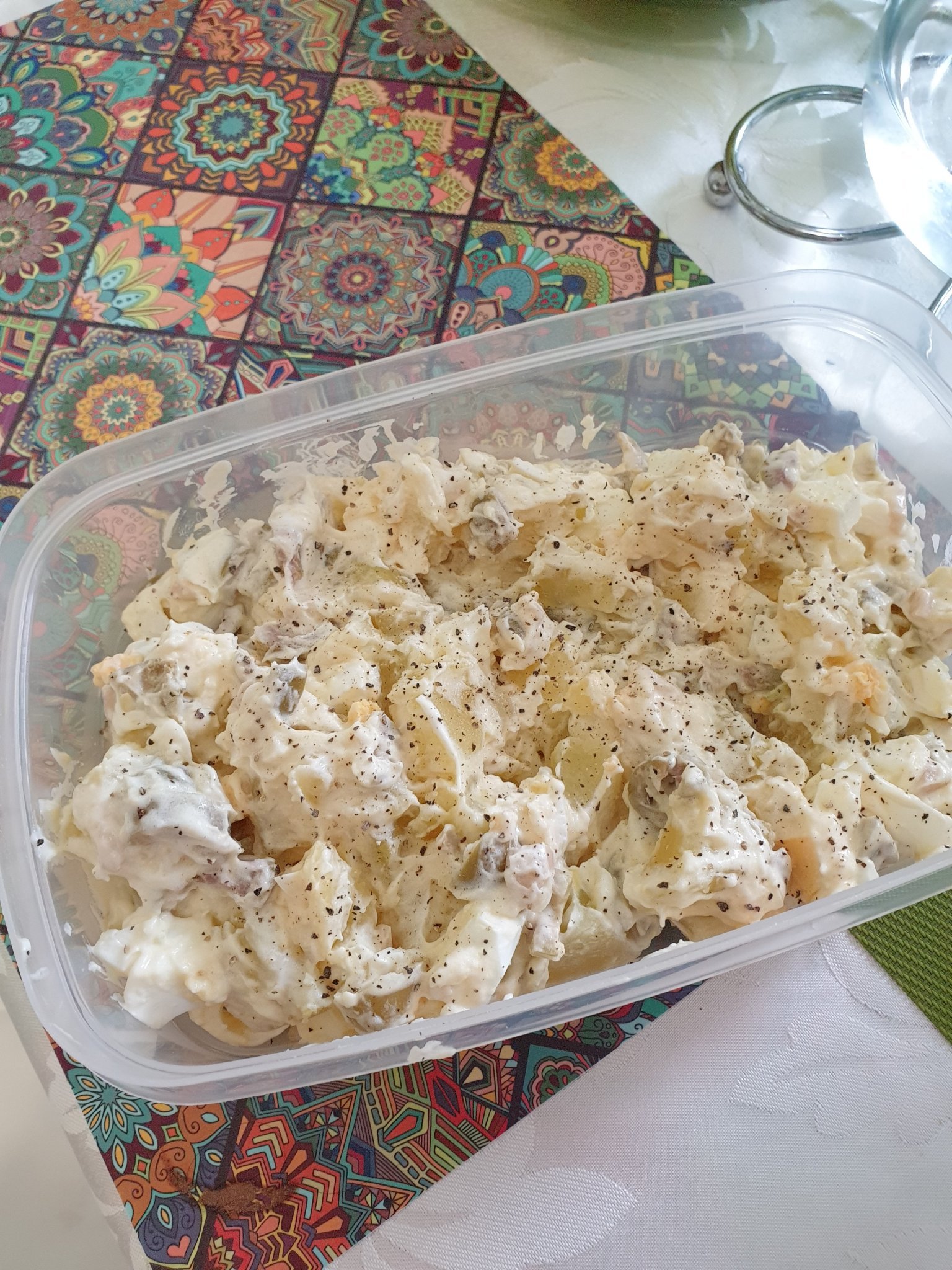За Телча - десетина кифтета, салата с майонеза, мариновани маслини с чесън , сварени картофи и варени яйца. Много е вкусна, но само една лъжичка ми се полага! Sweat Smile