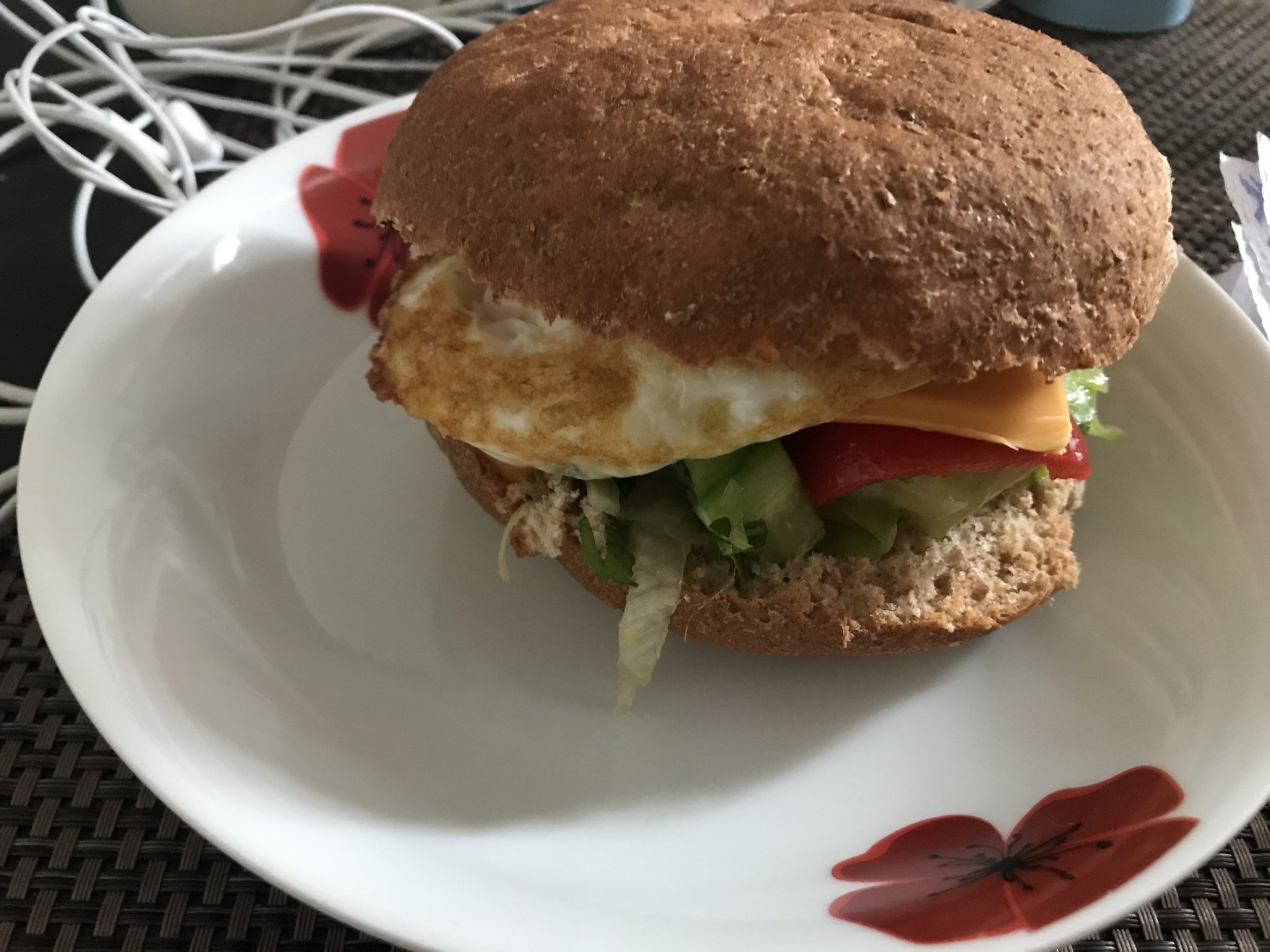 Бургер с яйце, зелени листа  и нарязани пресни  чушки. При мен най-важното нещо за деня е закуската😁. Вечеря може и да не  ям, но закуска не пропускам. Дава ми енергия. На обяд, ако съм гладна, може би ще хапна супичка  от спанак, ако не - грейпфрут. Отивам да свърша малко домакинска работа и после ще се разходя навън.