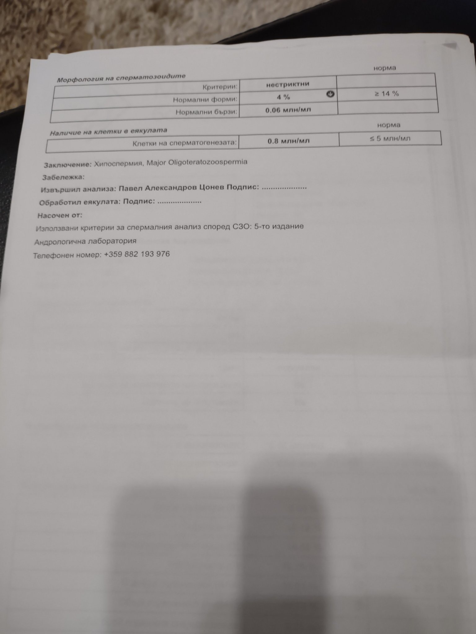 Здравейте , имаме ли повод за притеснение.Всичко е в норма освен морфологията ,която е почти на границата 13,5%,като извода все пак е тератозооспермия.
