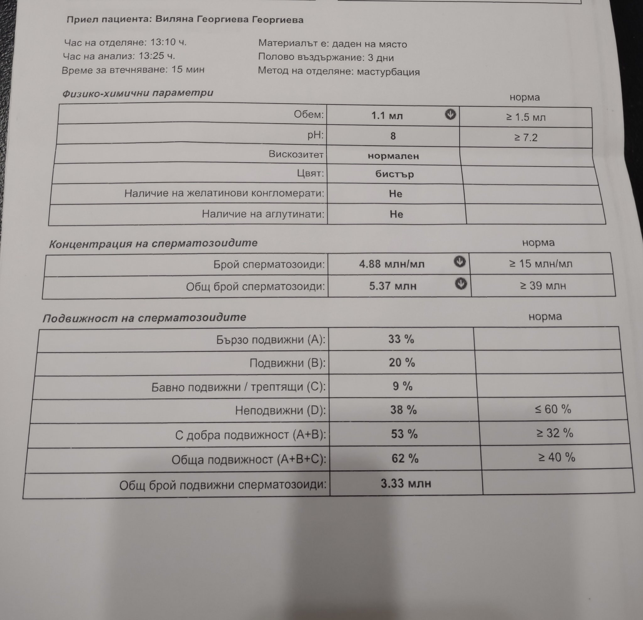 Sybeva,не чакайте. Пуснете спермограма и в друга клиника, едната трябва да е с морфология по Крюгер и да имат минимум 1 месец разлика в тестването. Виждала съм и при моя толкова.лоши резултати като на втората спермограма, че едва успяха да му направят ДНК фрагментация в Надежда с тях... Всичко е много индивидуално и в един момент може да е ок, в следващия резултата заради стрес или нещо друго да е лош. Ако мъжа ти пуши, да ги спира и му вземи антиоксиданти да пие. И за бира да забрави, тя вреди много.ММ пиеше преди всеки ден по 1-2, ама вече не,много рядко си позволява и то с повод.