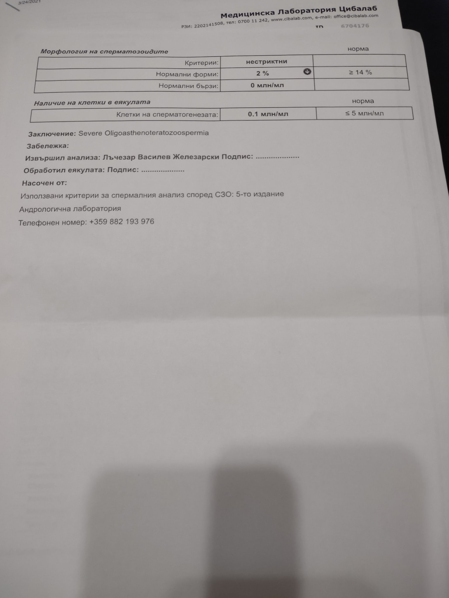 Първата е от 21.05, диагнозата се вижда на втората снимка накрая. Иначе началото на юли трябва да пуснем още една в клиника за репродуктивна медицина и да кандидатстваме по фонда, защото спермограмите трябвало да са от две различни клиники. Докато чакаме одобрение ММ ще пие предписаното от Кацаров и ще се надяваме на положителен резултат. На втората от 04.06, която е на последните 2 снимки, резултатите са по-лоши.На втората спермограма диагнозата е остра олигоастенотератозооспермия.