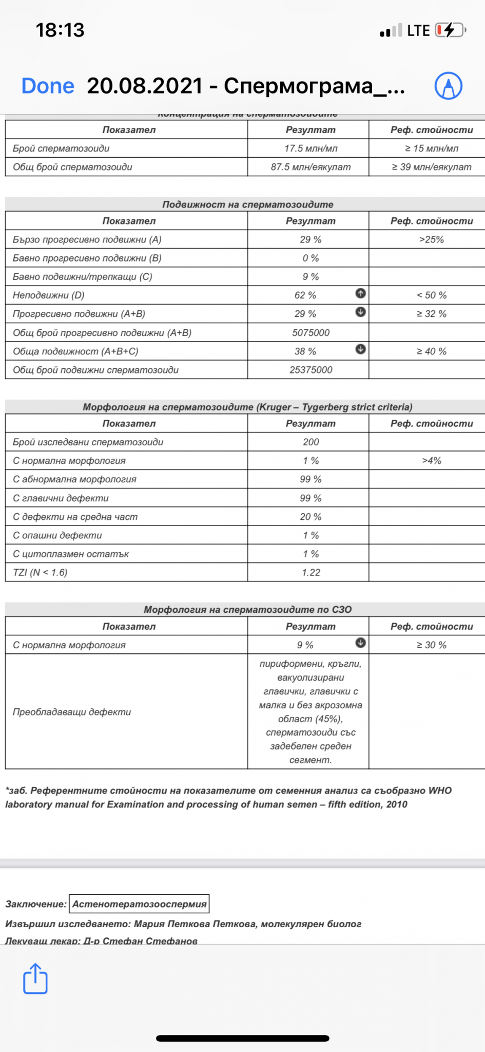 При мен нещата изглеждат съвсем наред. Вече 2г обикалям по лекари на мен ми направиха вс нужни изследвания преди да започнат да обръщат внимание и на неговите показатели. Имах една бременност, която приключи още в първите дни.
