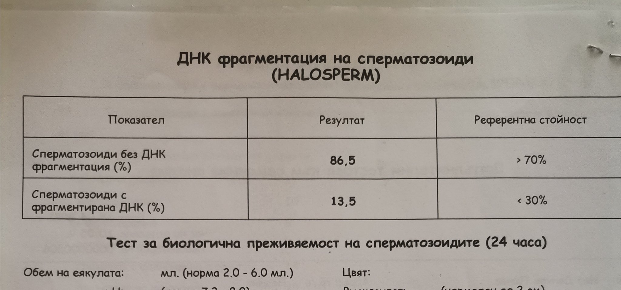 Прилагам снимка на спермограмата с ДНК фрагментация. Нещо съвсем се насметох, и не мога да разбера сега наред ли е или е зле положението.