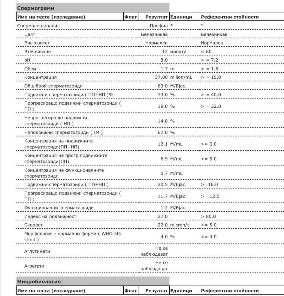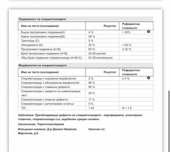 Здравейте , може ли да ми помогнете с разчитането на спермограмата на приятеля ми . Има ли нещо което трябва да ни притеснява ? Благодаря ви 😊