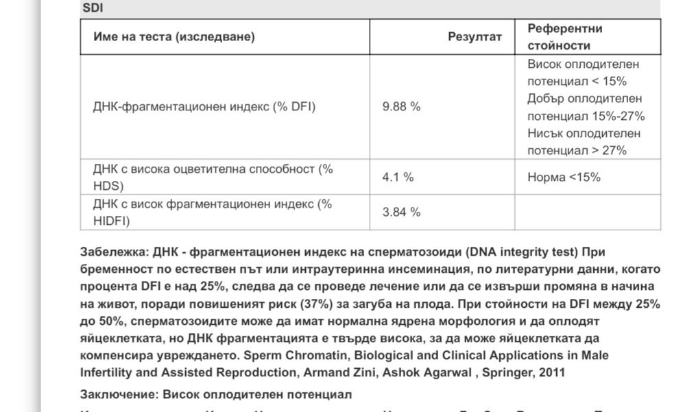Какво представлява SDI тестът в резултатите от спермограмата?