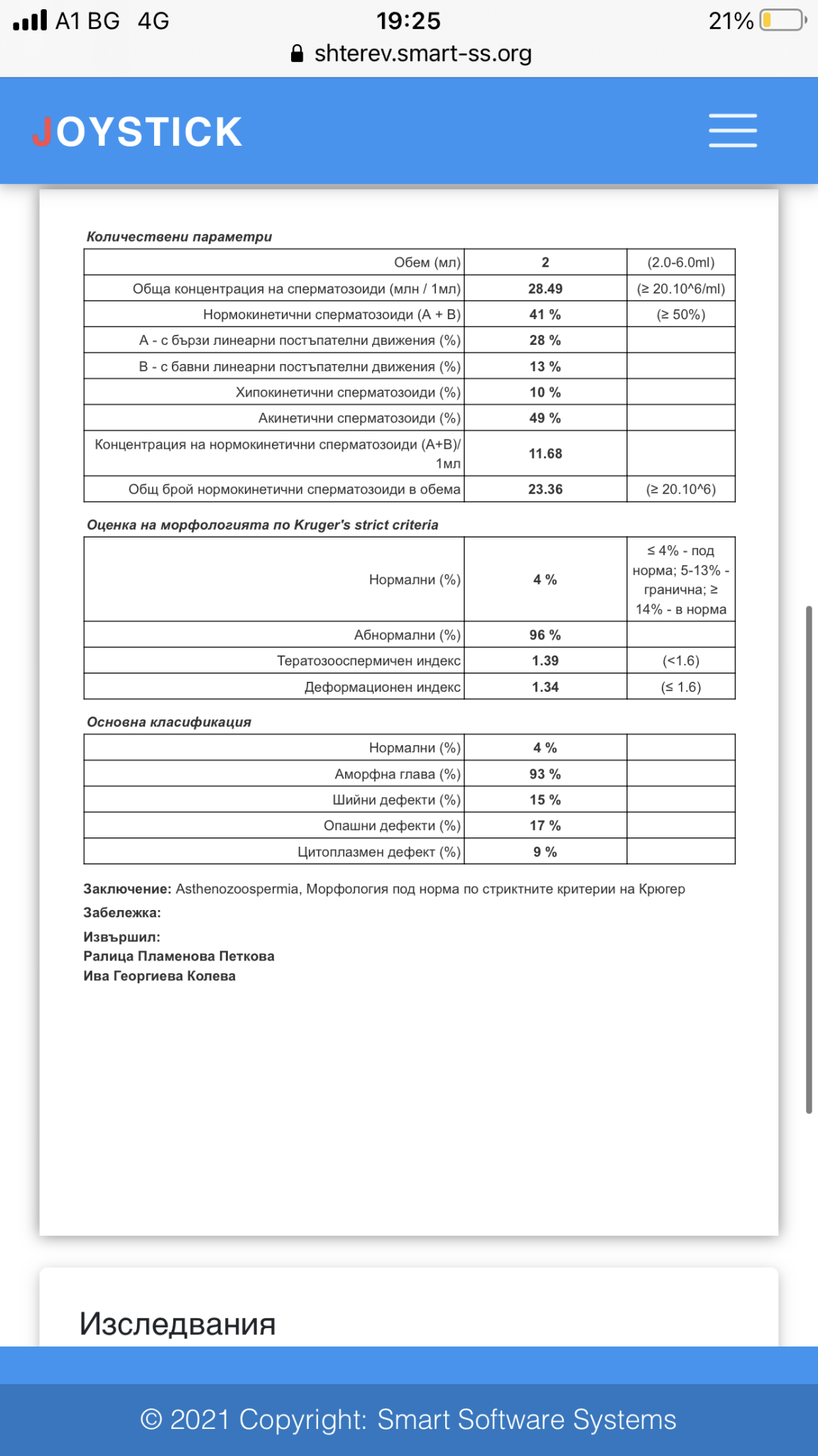Stefy, на фона на тази на моя мъж вашата ми се струва доста добра, имате добър процент подвижни, морфологията на повечето двойки в групата е ниска, има и с по 1-2%. При нас добавки не помогнаха, мм пие витамини и билки сега, но не чакаме да правят чудо, нещо като поддържащи съм му ги взела. Доколкото разбирам не сте правили още процедури, кандидатствахте ли по фонда или ще се самофинансирате? Мога да ви посъветвам да направите ДНК фрагментация на мъжа ви, а вие си направете цветна снимка да се види проходими ли са тръбите. Може да искате 2ро мнение в Надежда, имайте предвид че много трудно някой ще ви обърне специално внимание, трябва да сте настъпчиви и да питате,  на някои доктори им се вадят думите с ченгел. В Надежда ви препоръчвам д-р Чапанова и тя бърза, ноо може да я питаш и ти обяснява. Тя ни назначи и допълнителни изследвания,за да се покрият всички възможности, а не да си правим опити на сляпо. В момента съм на стимулация при нея, ще видим как ще се развият нещата, но имам добро впечатление. За Щерев не знам, но в Надежда недостатъка е че се чака за часовете, мен лично това ме изнервя леко.Ако имаш повече въпроси може да ми пишеш и на лично. 🙂