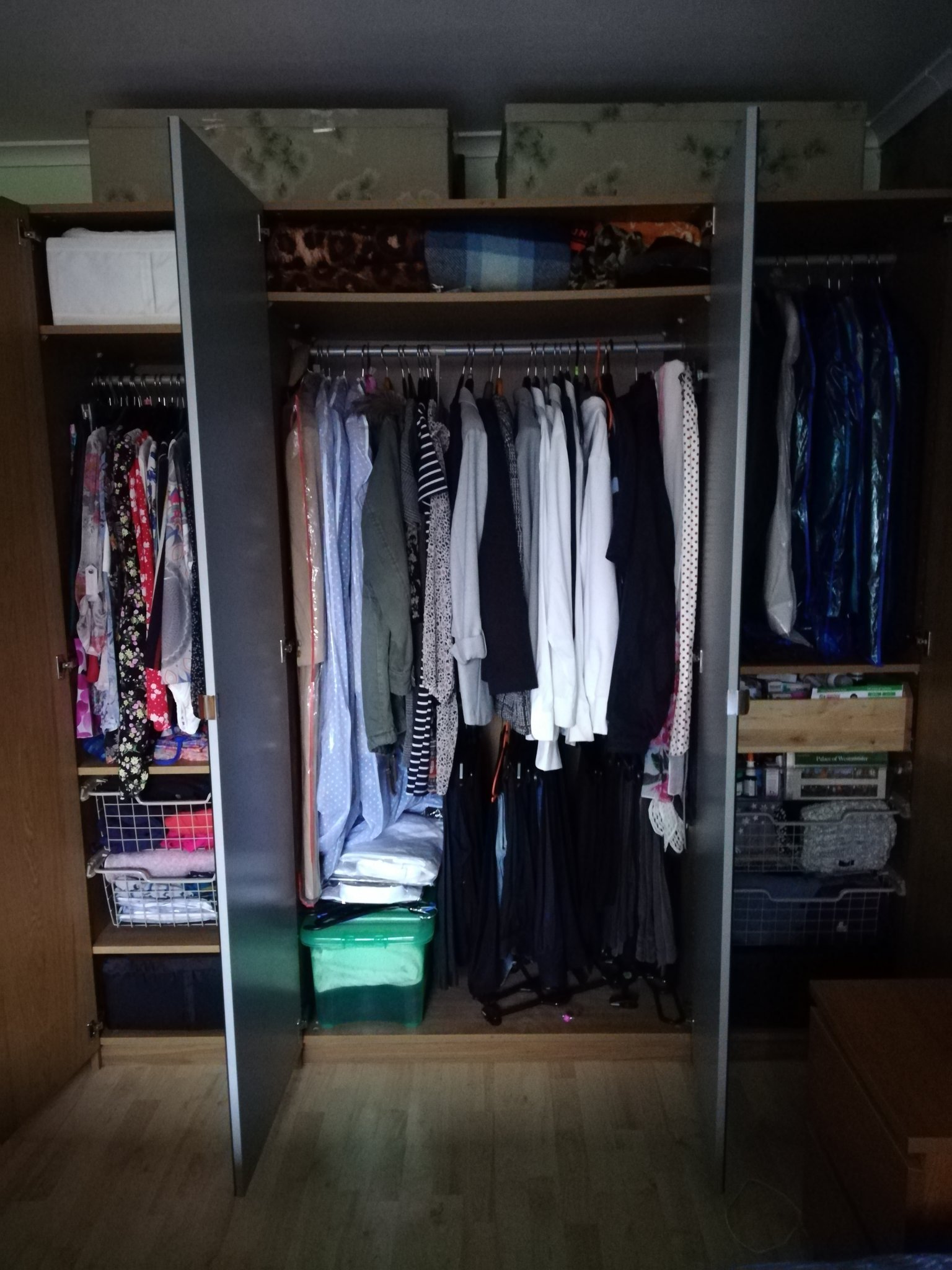 Аз също съм сложила два реда закачалки в ъгловата зона и горе един рафт за кутии. В по-късата част имам кошници+рафтове. В по-голямата рамката ми е 1 м. и в нея имам чекмеджета плюс лост за дрехи отново, плюс рафт отгоре.