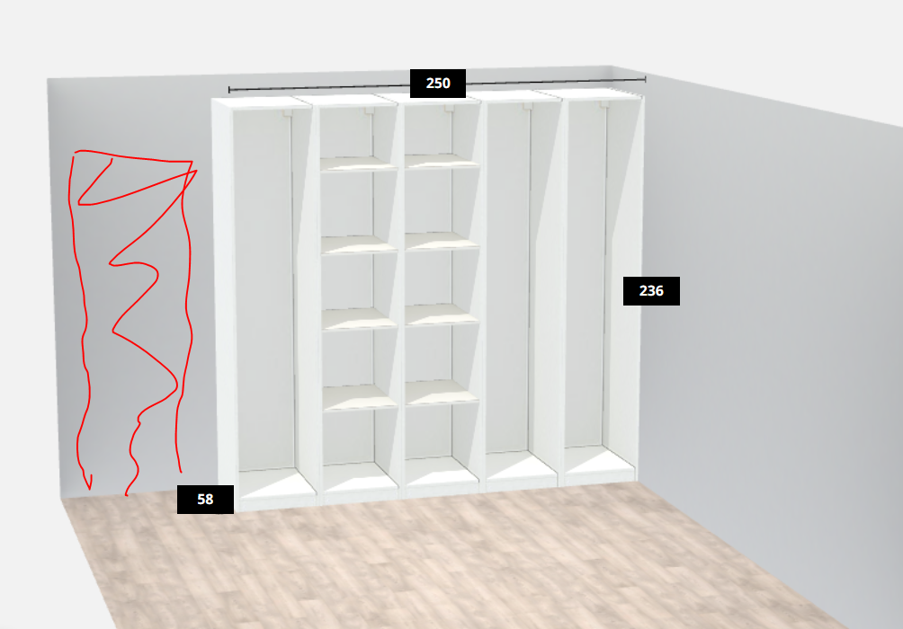 Доста опит с Пакс имам, в спалнята е точно с тези размери. 5-6 години ми бяха нужни да си го подредя да ми е удобно. В средата сложих 1 м. рамката с огледални врати, от двете страни по 50 см. Рафтове имах няколко в началото, сега останаха само два и то тези най-отгоре, там съм сложила платнените кутии с по-рядко използваните неща. В 50см. съм сложила релси за късите дрехи, а под тях са само кошници и чекмеджета. Исках само чекмеджета, но ми излиза доста скъпо, та ги замених с кошници. В средата имам една комбинирана релса за дълги дрехи и отдолу е закачена релса за панталоните. Не мога да я намеря тази комбинирана релса, тя е една и някъде по средата има едно закачено и втора релса, която може да се регулира, ако има повече дълги дрехи се събира доната релса, ако имаш нужда от не толкова място, се издърпва. Това е най-удобното нещо в гардероба ми. Много умувах за тази специалната джаджа за панталоните, ами това което имам събира двойно повече.Мога да направя снимки.