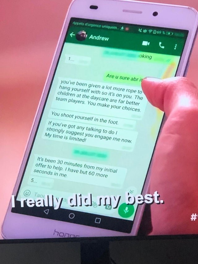 "даде ти се ти достачъно въже да се обесиш, така че от теб зависи. Децата от детската градина (на майка му) са по-добри отборни играчи (от Амира). Ти избираш. Ти сама се застреля в крака. Ако имаш нещо да ми казваш, направи го сега. Времето ми е ограничено! Минаха 30 минути от първото ми предложение да ти помогна. Останаха ми 60 секунди. 5..."