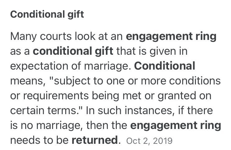 Тук пръстен се връща и от законова гледна точка се счита за подарък с условия - условието е сключване на брак и ако няма такъв, ответната страна, получила пръстена би следвало да го върне. Естествено тук става дума за абсолютен цирк между двамата с цел зрителски интерес, та за това и разиграването. Аз изобщо не вярвам, че Майк не й е върнал пръстена толкова време. Смятам, че всичко е за шоуто.