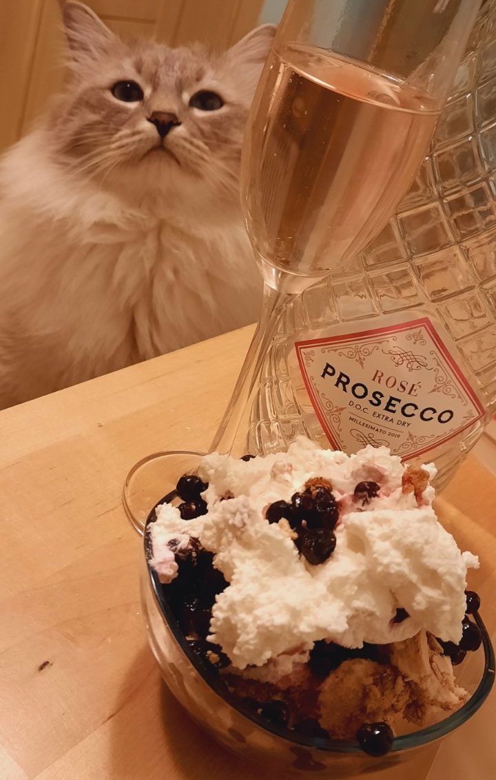 Последната снимка е един път! Страхотна, много ми хареса всичко от муцун на котарака до просекото и десертЯ 🥂  айде наздраве  Simple Smile  и цун по муцун