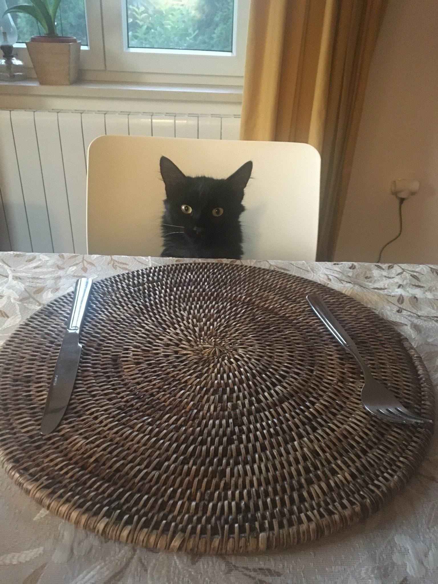 тук просяка , се е курдисал на табуретката, ние с ММ десертираме, а той ни спами