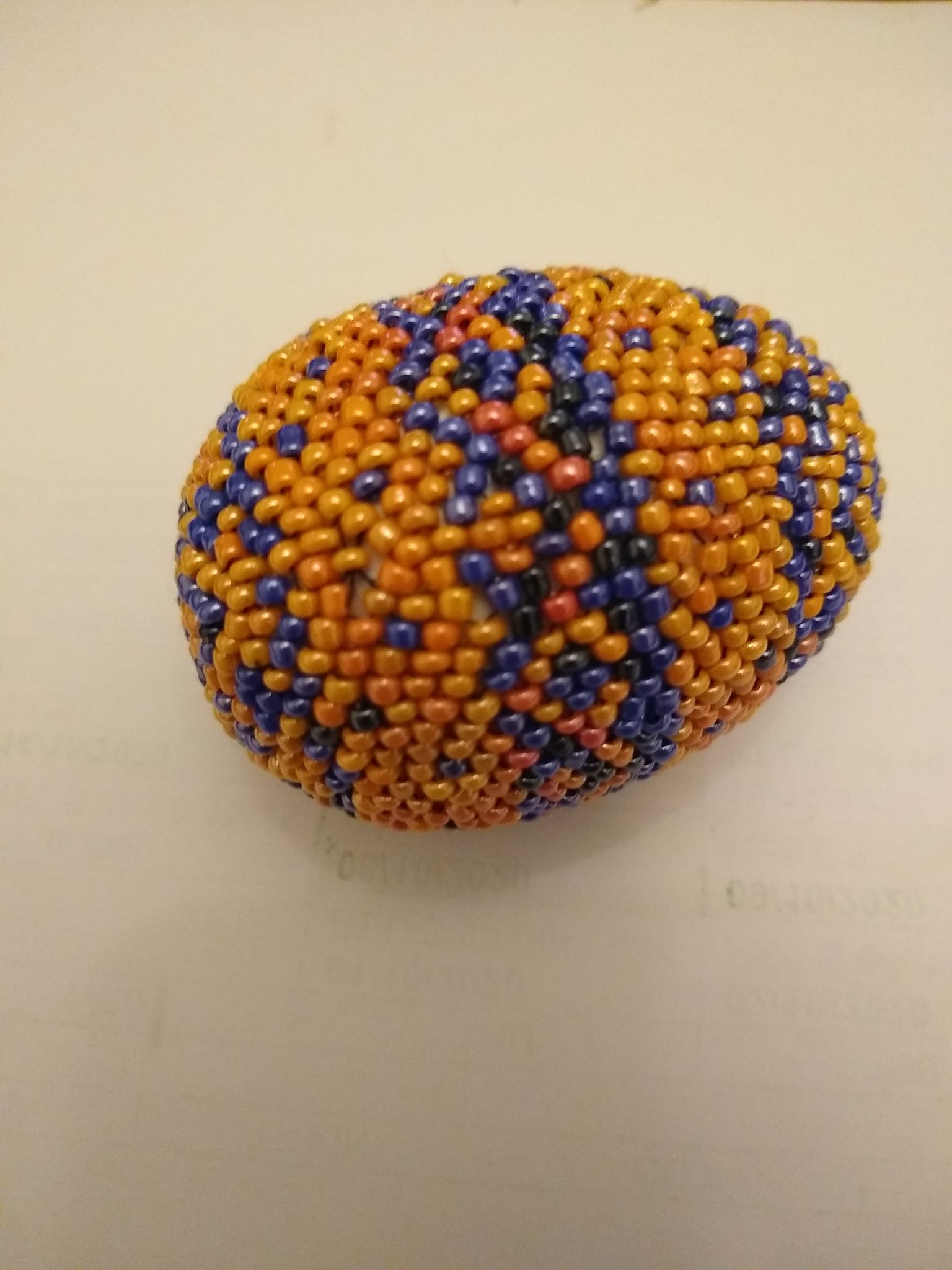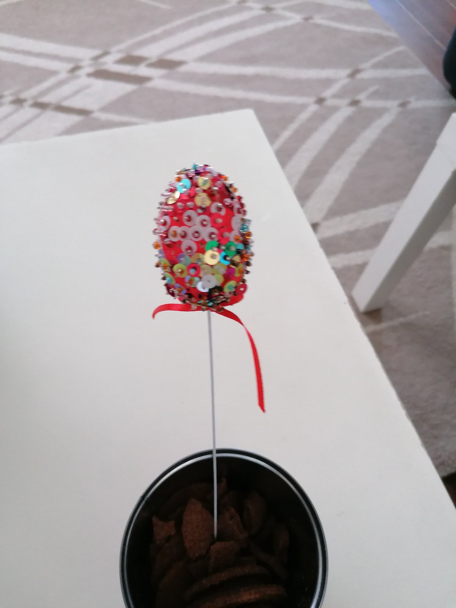 Лейди, имам подобно яйце. Но през дупката на мънистото е мушната топлийка, а под мънистото има лъскава пайета. После ще покажа. Справила си се чудесно, не търси грешки, а му се радвай.