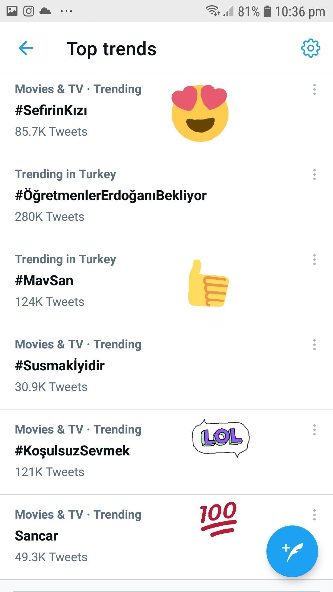 Само забележете на първата снимка колко тага на сериала с се качили в тренда в Турция.А ги преброих- всичките.(Sefırın kızı,MavSan,Sancar,koşılsuzsevmek),а също и имената на Енгин и Туба!Пример за любов и подкрепа!
