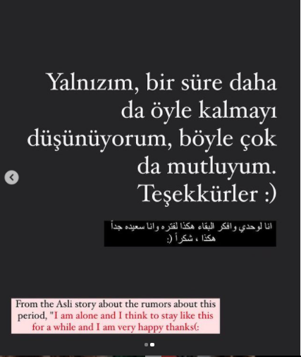 Аслъ това го написа, защото в пресата от време на време я свързват отново с Мурат Боз. Бирсен попита "Не е ли най-голямата ѝ любов Оли?" /кучето от приют, което Аслъ осинови/. Миналия месец последвала фен на Мурат в ИГ, но като разбрала, че и той го следва, се отписала. Joy Новата песен на Мурат била посветена на нея, момичето от клипа на песента приличало на нея - с това хората си заработват хонорарите.