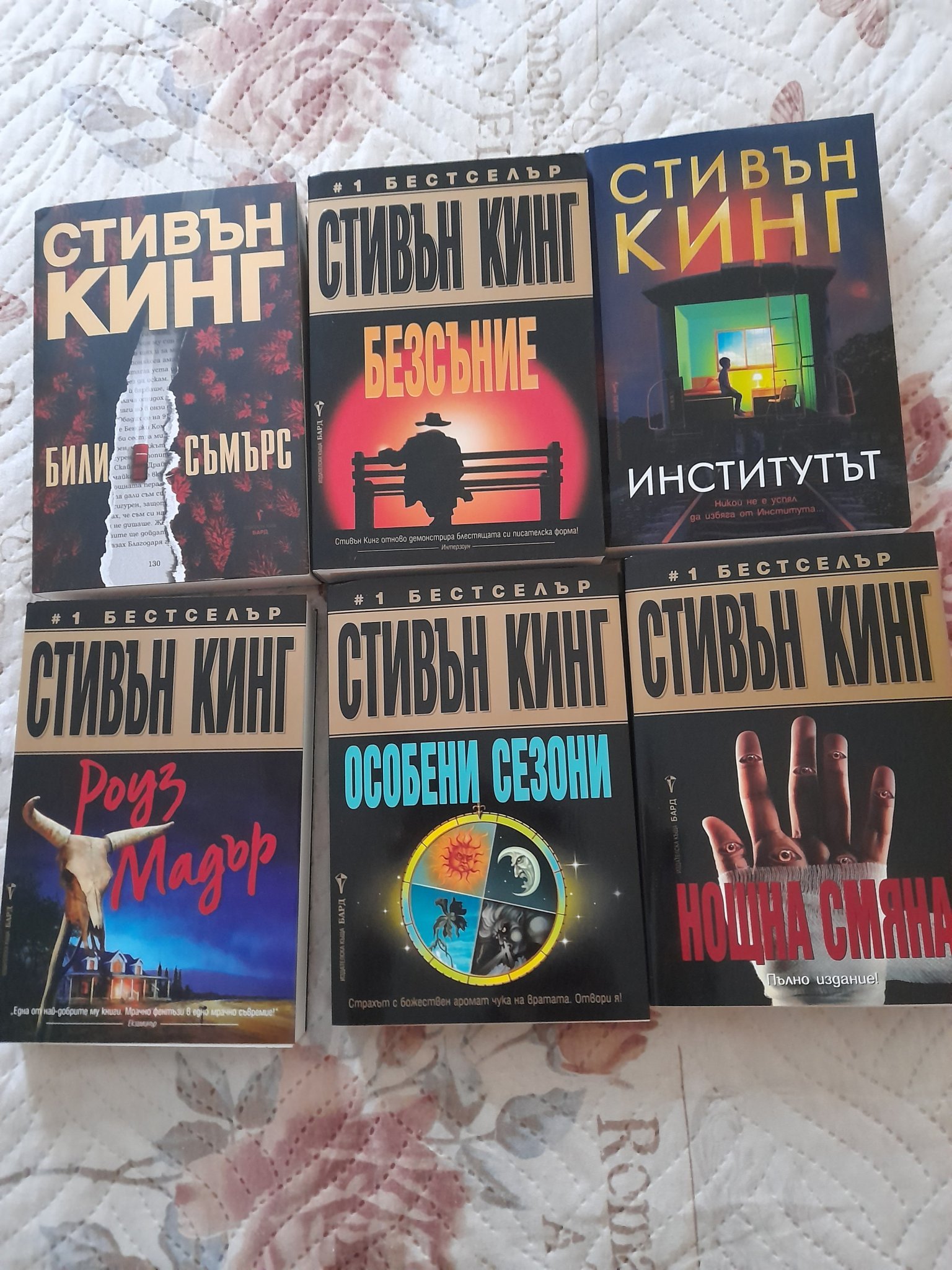 Прочетох Нощна смяна и Особени сезони. Разказите в Нощна смяна ги бях чела, но си ги припомних. Харесват ми. Особени сезони съм гледала екранизациите на Изкуплението Шоушенк (страхотен филм) и Способен ученик. Харесаха ми новелите. Лятото на покварата (Способен ученик) ме отврати. Хем ми беше интересно, хем изпитвах отвращение и към двамата главни герои. Това го може само Кинг! Simple Smile  Започнах Роуз Мадър. Чела съм я отдавна и искам да си я припомня.