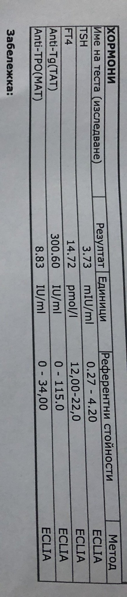 Това са изследванията ми от вчера, ТАТ е паднал от 420 на 300, но пак си е два пъти по-висок! ТСХ за мен е висок, това за 6 г., откакто съм диагностицирана с Хашимото, е максималното ниво на ТСХ, не съм вдигала повече от 3,8!
