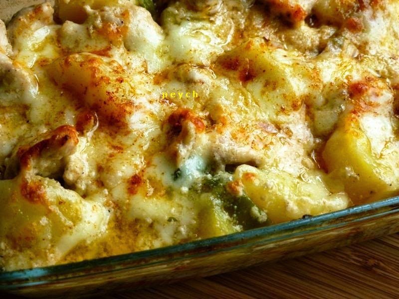 Нарязано на парчета и объркано със сол,пипер,майонеза ,горчица.Като се изпече се поръсва с кашкавал и се запича само за коричка .Пак за около половин час е готово .