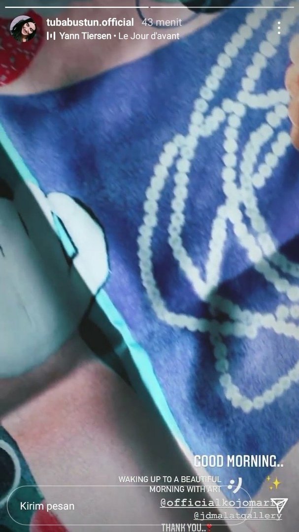 Сегодня в своем Instagram-аккаунте Туба демонстрирует красивый шарф с большим количеством произведений искусства. Этот шарф из галереи JD Malat от Коджо Марфо из Лондона, Великобритания, как видно на табличке с именем на видео. Приятно, что она всегда получает особые подарки от людей из-за границы