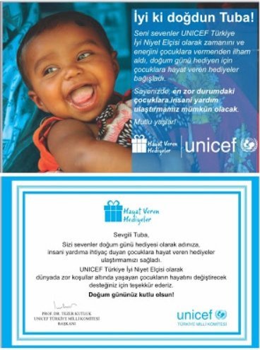 Поклонники Tuba Büyüküstün также организовали благотворительную кампанию в день рождения актрисы через Unicef. Любители Tuba Büyüküstün, выступившие под лозунгом «Пусть детский день рождения станет надеждой для нашей Тубы», собрали пожертвования с большим участием из Турции и из-за рубежа. Согласно информации, предоставленной Unicef ​​Turkey, эта сумма пожертвования составляет 465 лечебных продуктов. Эти питательные вещества обеспечивают каждому недоедающему ребенку примерно 10 дней лечебного питания в пакетах по 30 штук.