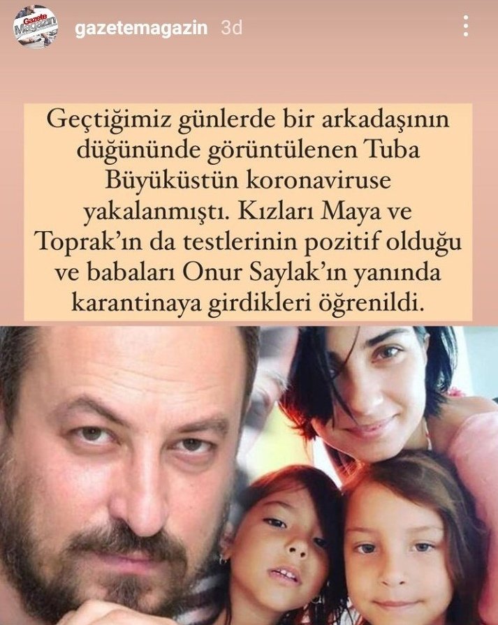 Туба Бюйюкюстюн, которую в последние дни видели на свадьбе подруги, заразилась коронавирусом. Стало известно, что анализы ее дочерей Майи и Топрак также положительные и они находились на карантине вместе со своим отцом Онуром Сайлаком.