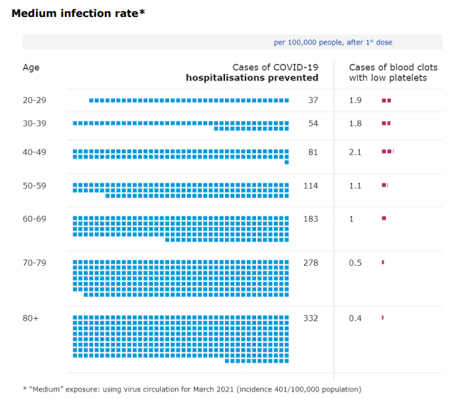 Дори да приемем, че например в София степента на разпространение е средна, въпреки че нашето тестване е доста по-малко, отколкото в други държави, ето как изглеждат ползите от ваксината (предотвратени хоспитализации) vs рисковете от ваксината за различните възрастови групи (сините квадратчета са ползите, червените са рисковете).