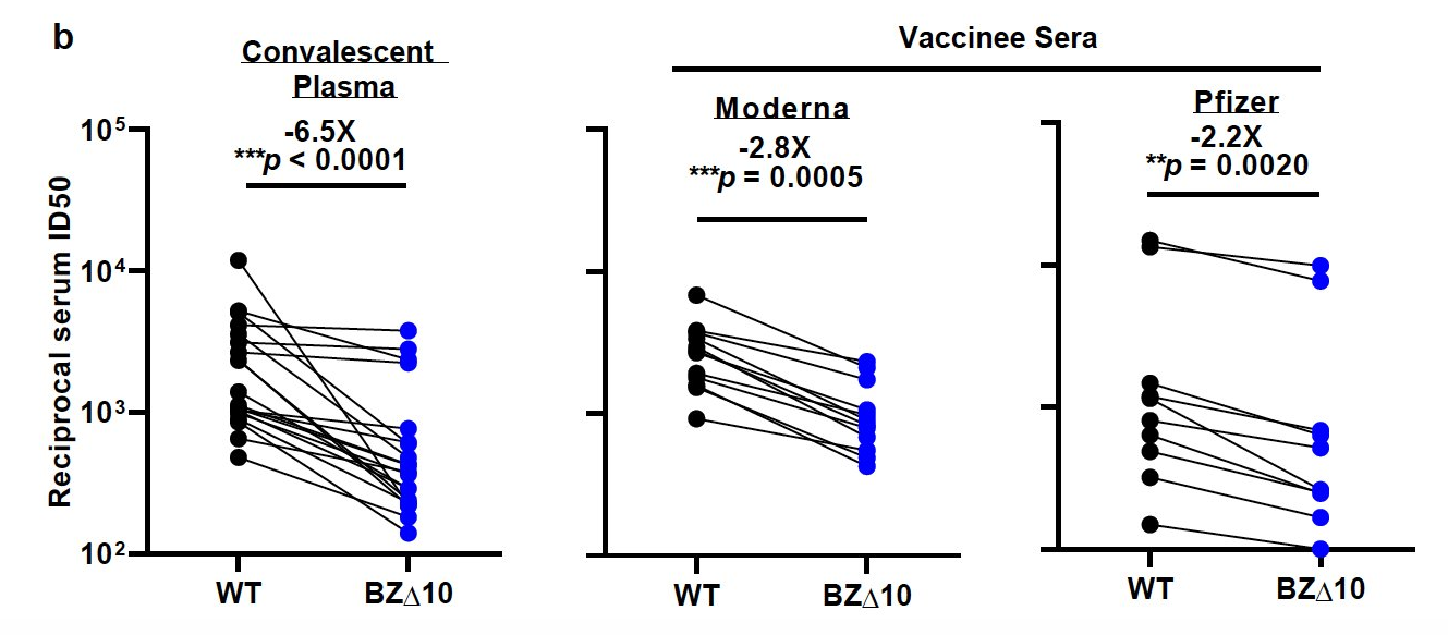 Според тези проби от 20 преболедували и 22 ваксинирани, бразилския вариант намалява ефективността на неутрализиращите антитела до 6.5 при преболедували и до 2.2 пъти при ваксинирани с Файзър и до 2.8 път с Модерна. За сравнение данните за южно африканския вариант показваха 13.3 пъти спад при преболедували и 7.6 пъти при Файзър.
