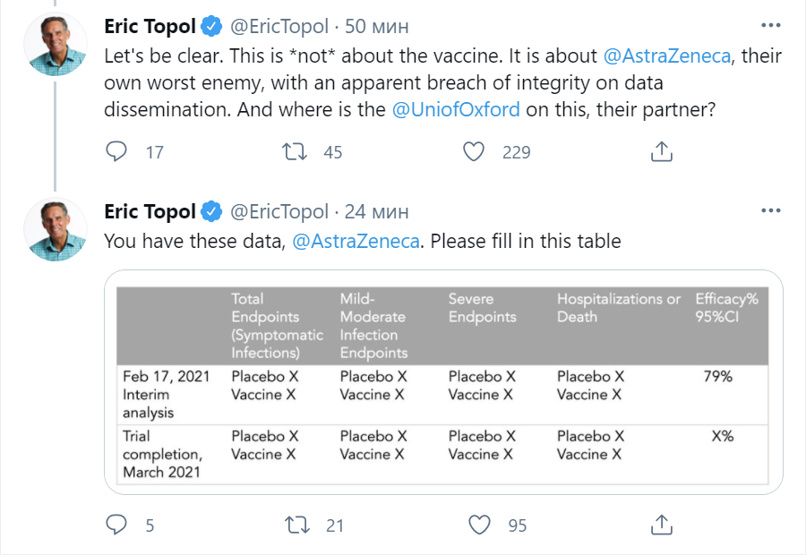 Иначе 11 независими експерти твърдят, че между февруари и март са се срещали с компанията и ефикасността на ваксината е била между 69 и 74% и не е трябвало да се избързва с обявяването на най-високия възможен резултат от по-ранни данни или въобще какъвто и да резултат преди всичко това да бъде изяснено между борда и производителя, както се прави по принип.
