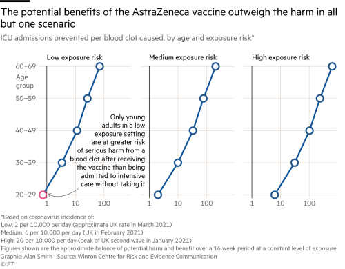 Британският регулатор вече излезе с данни за това. Затова и вече не препоръчват ваксинация с АЗ на хора под 30 години. Рискът при тях е по-голям от ваксината от колкото ползите при слабо излагане/разпространение на Ковид. При средно и силно излагане, риск и ползи се балансирали. Излязоха с доста графики, за да обяснят на населението по възможно най-достъпен начин това. Тук в темата също ги видях публикувани.