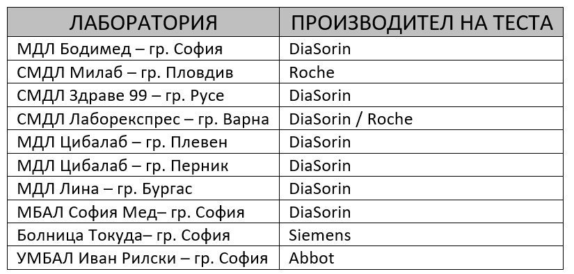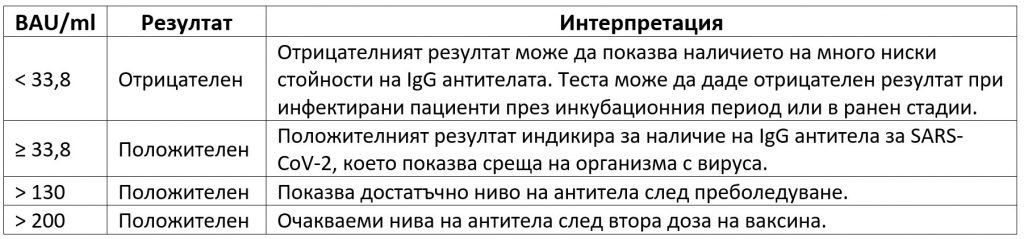 Тази информация е излязла в някои лаборатории у нас: "Съгласно препоръките на Световната здравна организация /СЗО/ тестовете за доказване на специфични антитела към SARS-CoV-2 трябва да се актуализират към  първия Международен стандарт (IS) . Целта на приравняването на получените стойности към стандарта е проследимост на резултатите във времето и възможност за сравнение между различните анализатори и лаборатории. Новите стойности се изразявaт в BAU/ml (Binding Antibody Units). Променени са съответно и препоръчителните стойности, като интерпретацията е показана в таблица. Повечето големи лаборатории в страната (приложена непълна таблица) ще изразяват резултатите за количествените антитела срещу Коронавирус според производителя на теста. За пациенти направили изследване в изброените лаборатории да имат в предвид, че резултата се приравнява към BAU по следния начин: