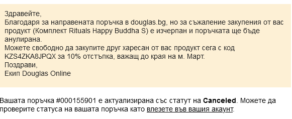 Пиша огромен минус на Дъглас обаче. Получих 2 имейла, с които ме информираха за забавяне в рамките на 3 работни дни и необходимост да съберат всичко от различни магазини.... днес ме уведомяват, че поръчката ми е анулирана! Бил изчерпан комплекта на Rituals, който поръчах за приятелка и заради това ми отказват цялата. Без да се обадят, да попитат дали искам останалите артикули или да заменя, за да ползвам все пак безплатна доставка.