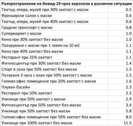 Таблицата представя резултатите от изследване на Техническия университет в Берлин за разпространение на коронавируса чрез аерозоли (т.е. независимо от всички мантри за дезинфекция и дистанция, които мнозина у нас си мислят, че решават всички проблеми).