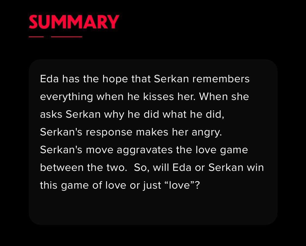 Резюме: Еда има надеждата, че Серкан помни всичко, когато я целуне. Когато тя пита Серкан защо е направил това, което той е направил, отговорът на Серкан я ядосва. Ходът на Серкан утежнява любовната игра между двамата. И така, дали Еда или Серкан ще спечелят тази игра на любов или просто „любов“?