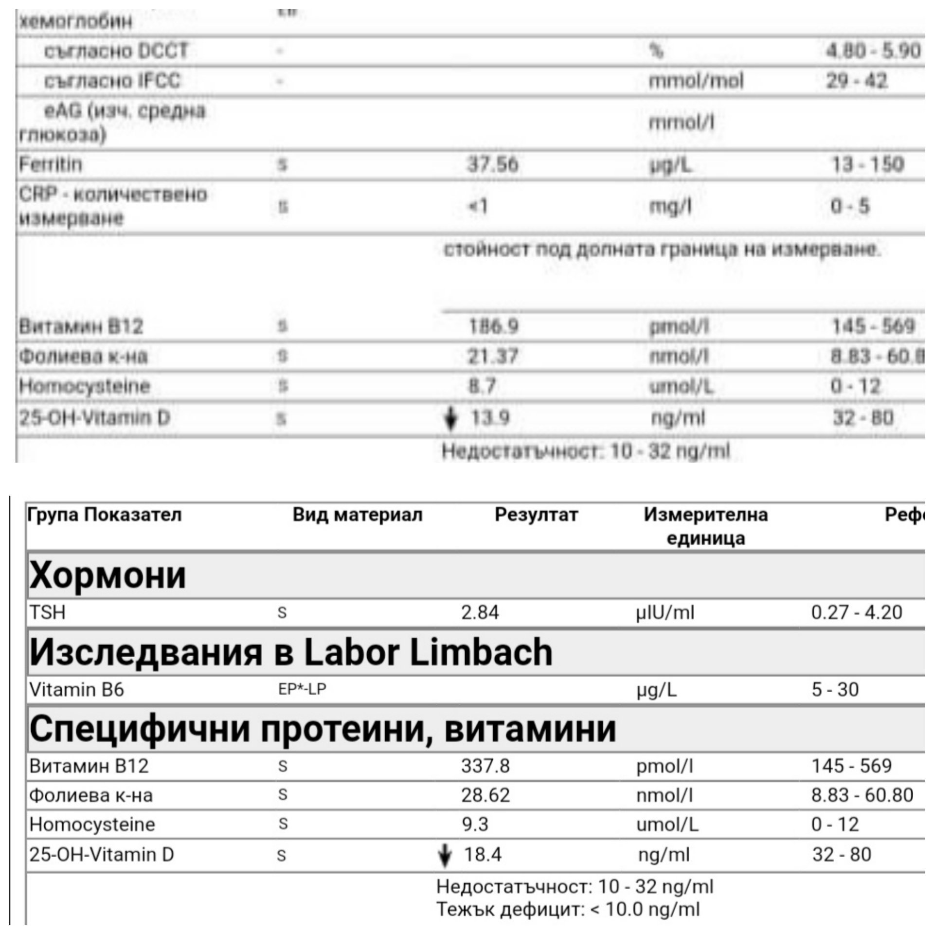 Привет отново от мен, пуснах кръвните изследвания тази сутрин и като гледам имам подобрения в сравнение с миналата година, но не във всичко.. Мисля да започна приема на Витамин Д и фолат, но за Б12 се колебая, за да не го кача много преди евентуална бременност. За Б6 ще почакам повече време.