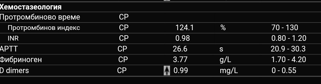 В 8+3 бях на преглед при др. Сигридов, според който нямам нужда от терапия за сега и очаква така да си остане. Но тогава ми пусна изследвания, които до другия петък няма кой да ми разчете (голяма философия ....) и вече 2 седмици седя и ги гледам и се притеснявам с този d dimers.