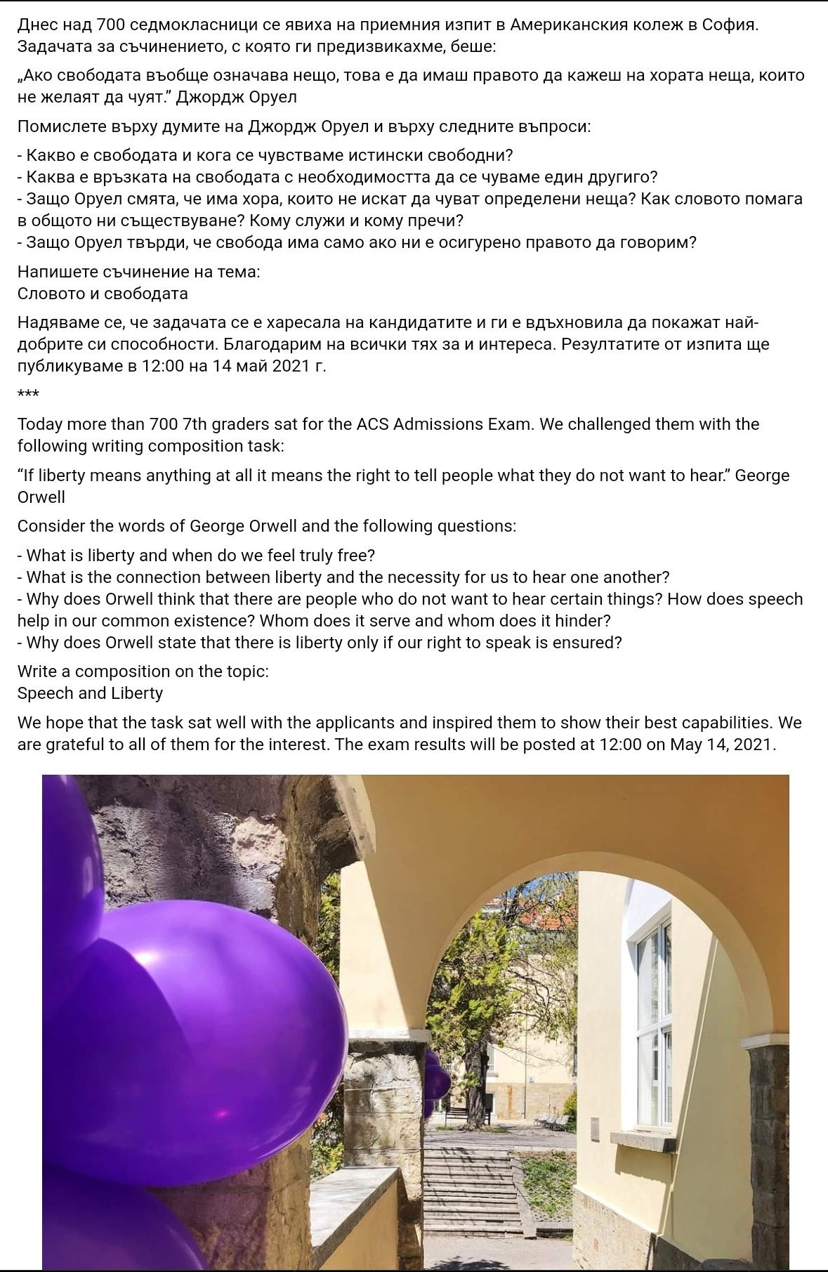 Есето е било за свободата на словото, по цитат на Оруел. Имало е доста въпроси. Не му е стигнал листа, поискал е друг, не са му дали и е трябвало да трие последните изречения, за да пише заключение.