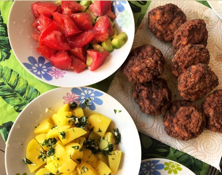 Кюфтета , картофки, салата