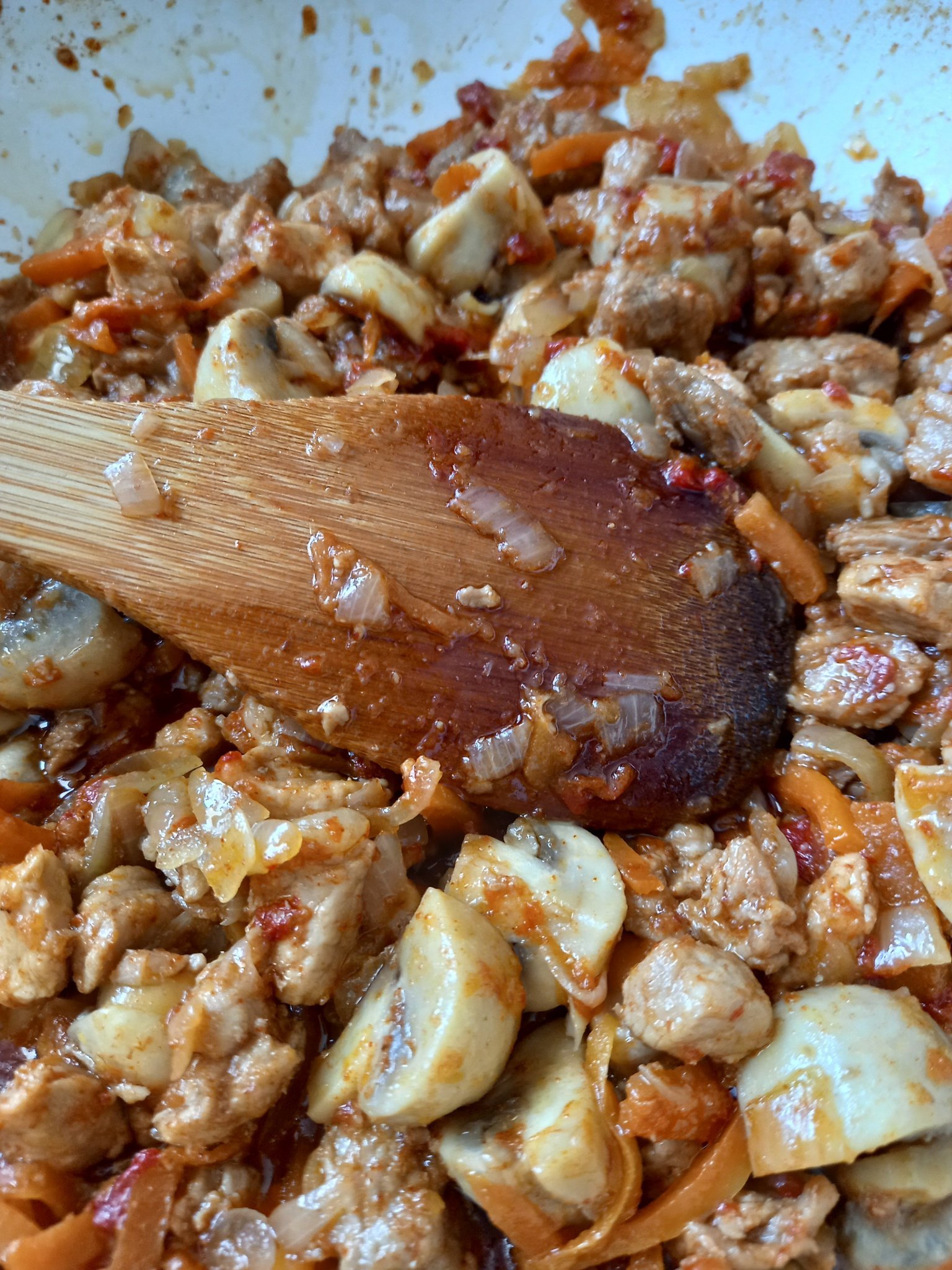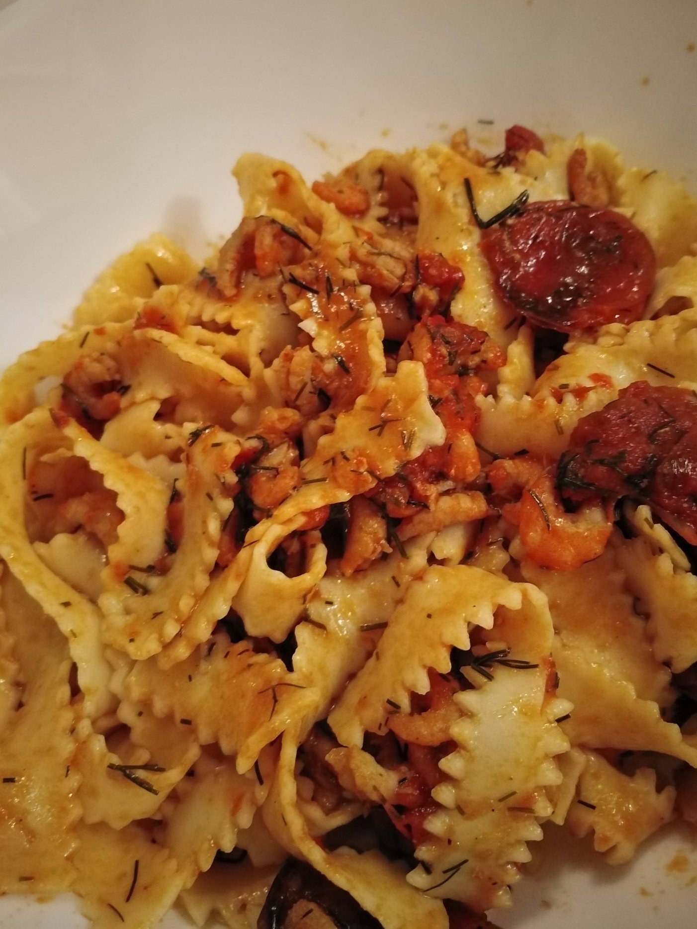 Една приумица на съпружието от преди малко. Свинско на късчета с морков, лук, гъби и чушка. Дотук добре, но реши, че ще го яде с... юфка. Честно казано, вкусно си беше и съм щракнала моята порция, даже е започната Stuck Out Tongue Winking Eye