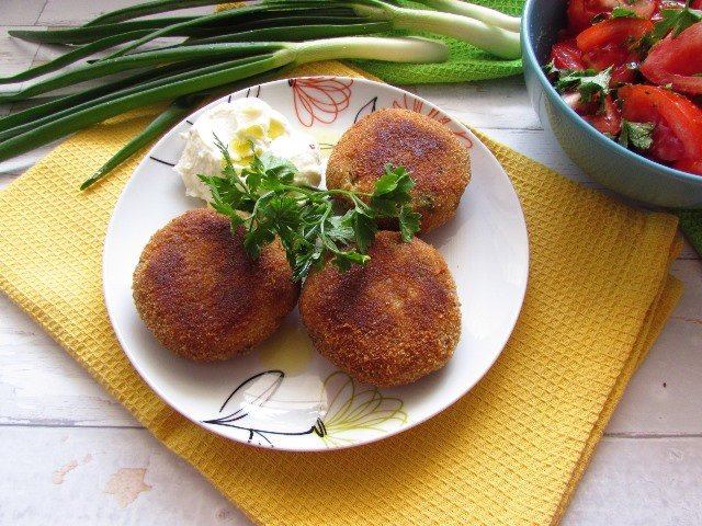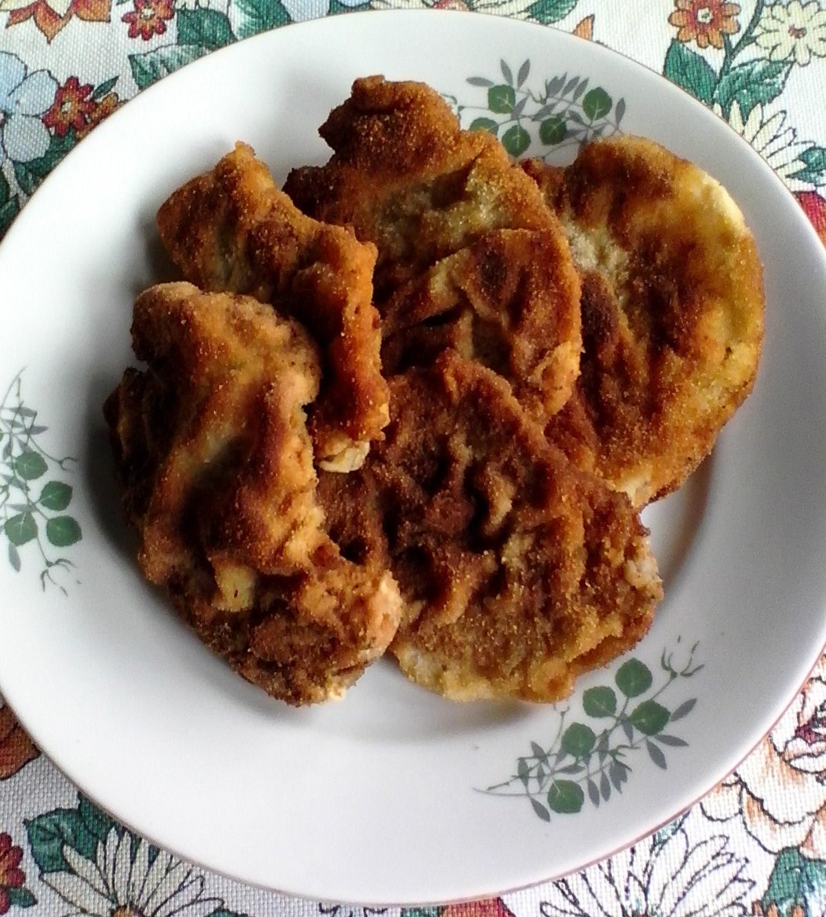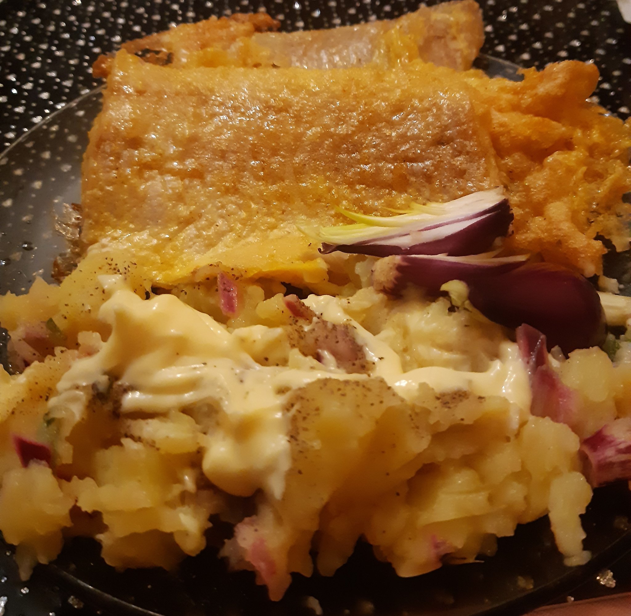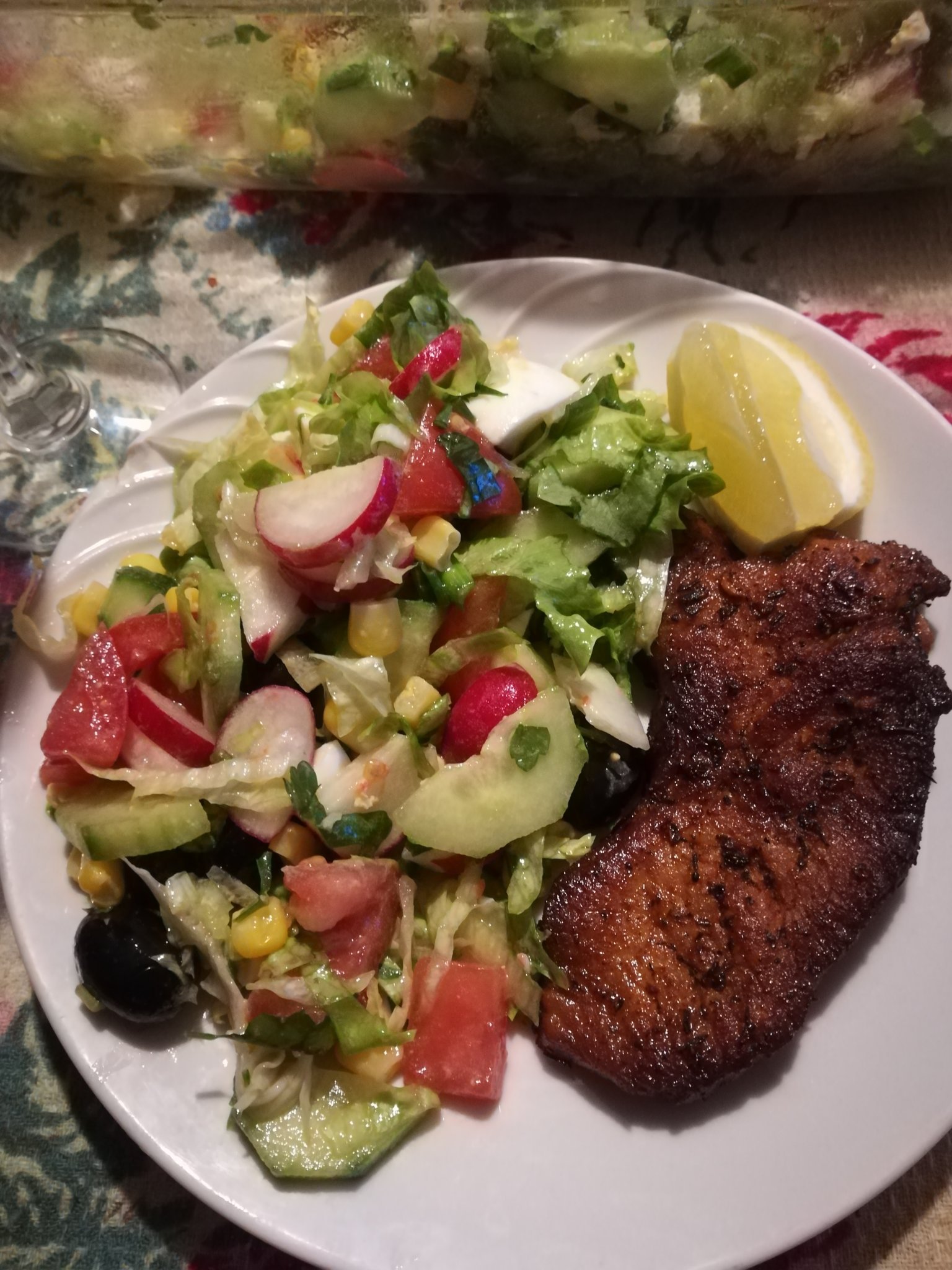 От мен много нескопосана снимка (разяснение: на преден план- картофена салата с майонеза... следва- рибата) на  вечерята- панирана бяла риба на фурна (повече няма да пържа риба)