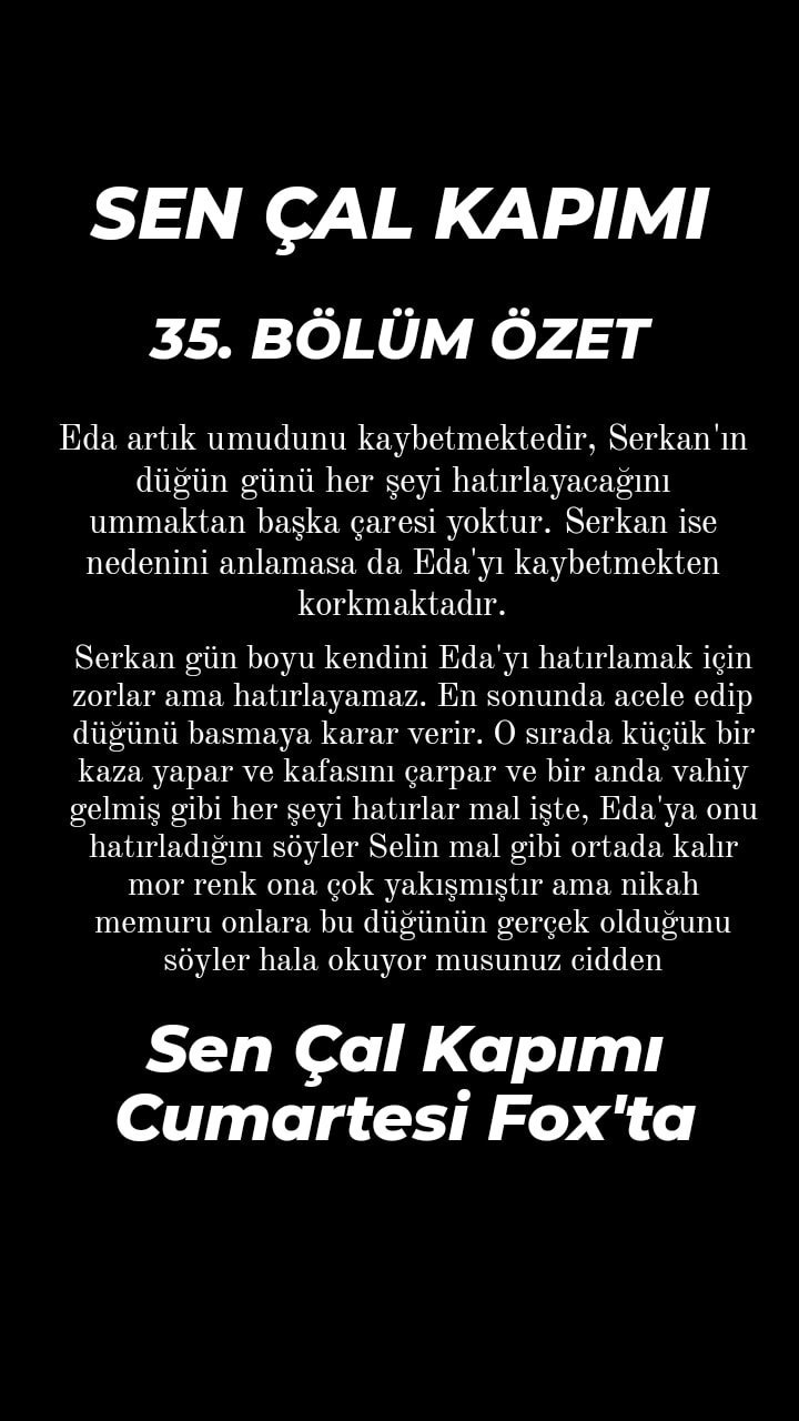 Цял ден Серкан се опитва да си спомни за Еда, но не успява. В крайна сметка решава да побърза и да спре сватбата. Докато отива натам, катастрофира леко, удря главата си и в този момент, изведнъж успява да си спомни всичко. Когато казва на Еда, че я помни, Селин се вбесява, но брачната служителка им казва, че този брак е истински.