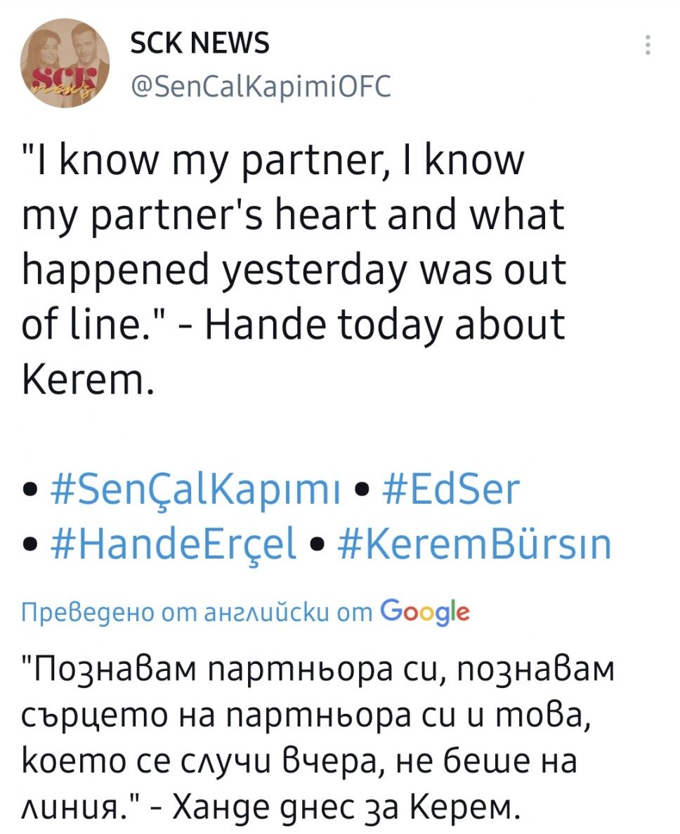Ееее, най-после ги изловиха само двамката. Те бяха доста притеснени. Сигурно и снощната издънка срещу Керем е подействала на настроението им. Личи си, че много не им се говори. Напълно ги разбирам, защото аз съм от този тип хора, които не обичат много да се шуми около мен. Това ме притеснява. А от както започна сериала не ги оставят на мира. Все едно и също ги питат. Ако са искали до сега щяха да кажат. Сигурно има много причини, поради които засега предпочитат да не афишират отношенията си. Ханде много възпитано и спокойно отговори на журналиста на въпроса за новия дом и дали Керем идва на гости там:  "В крайна сметка искам вашето уважение към личният ми живот и моят дом."  Прекрасно се държат и двамата. Успяват да запазят спокойствие и винаги са вежливи и любезни.