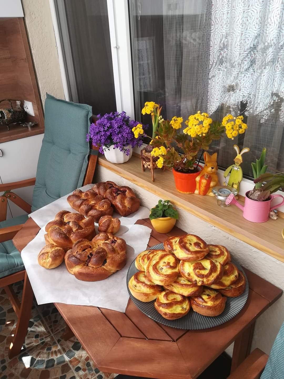 Замесих едно тесто и от него направих два козунака само със стафиди, два с три плитки с различни плънки - сладко, стафиди и локум, един със захар, масло и стафиди, и този зле изглеждащия в дясно, който стана уникално вкусен - с шоколад и халва, който сплетох тип "бабка". Направих и брьоши с крем и стафиди, а крайните парченца изпекох в чашки като козуначени мъфини.