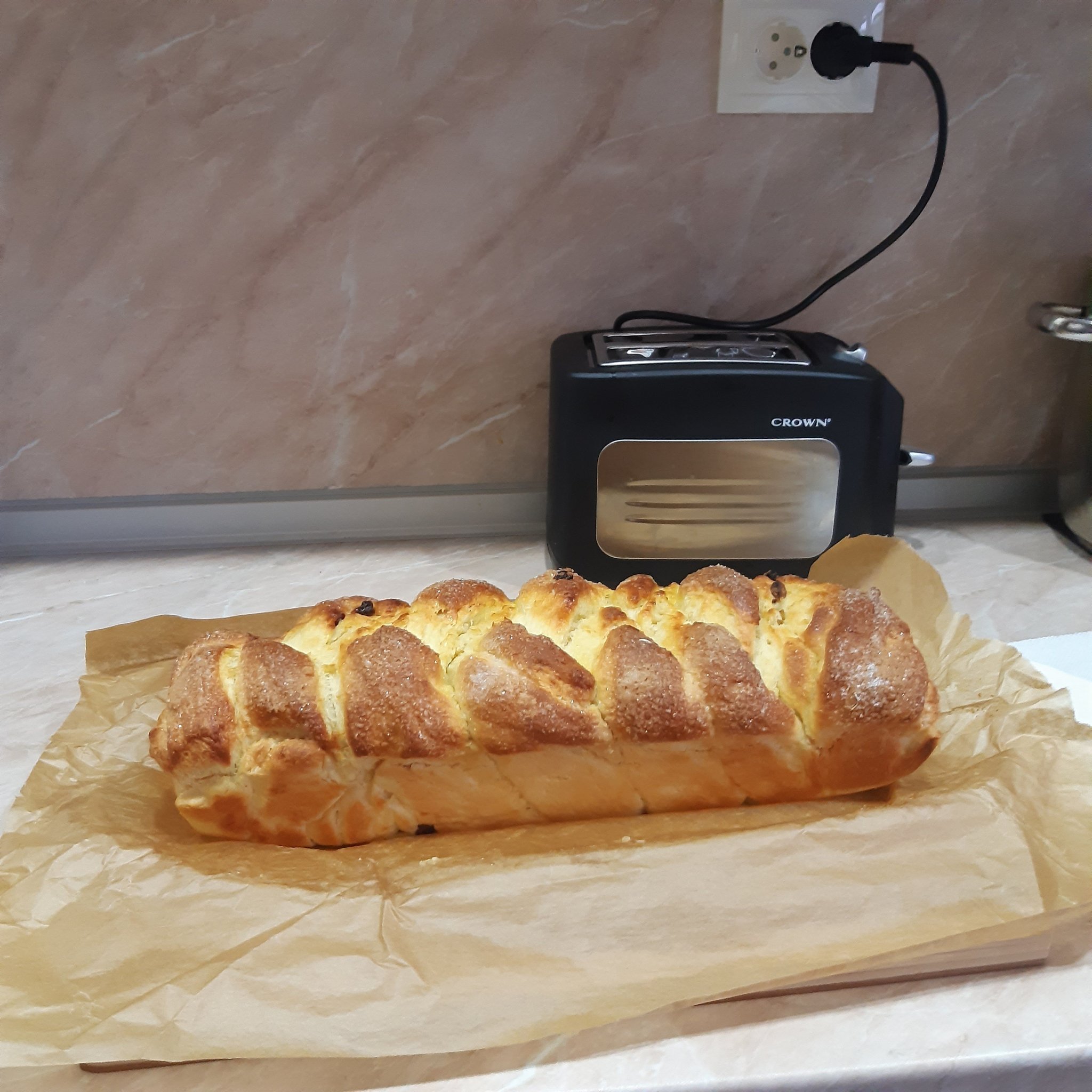 Два козунака по рецепта на Морена. С брашно за баница и жива мая. Опъна ми се и отказа да втаса. От вчера на обяд, та чак днес сутринта, в седем, беше удвоил обема си и го изпекох. Но пък се получи екстра, единият подарих на племенничките.