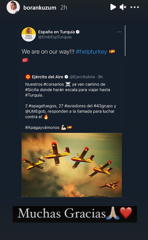 Пожарите бяха единствената тема на публикациите на Боран в ИГ. Благодарил е за помощта от Испания.