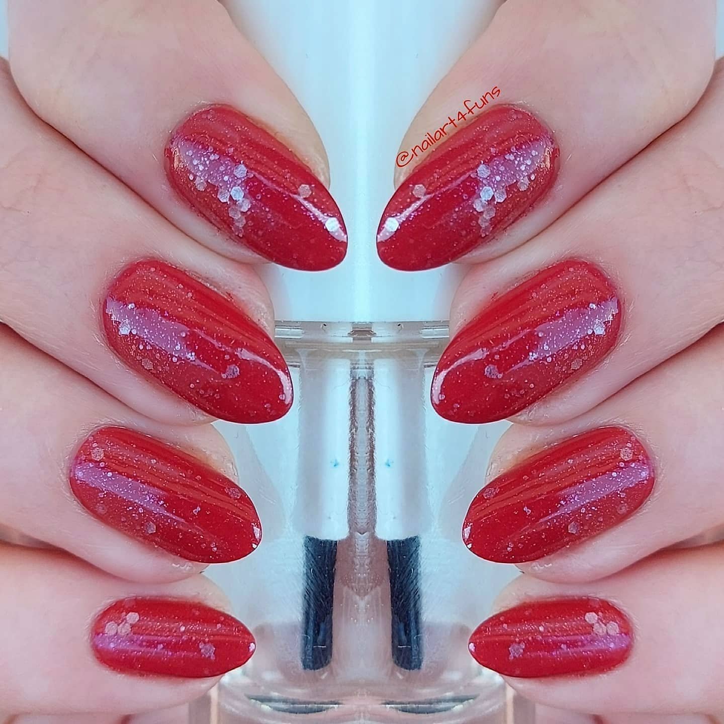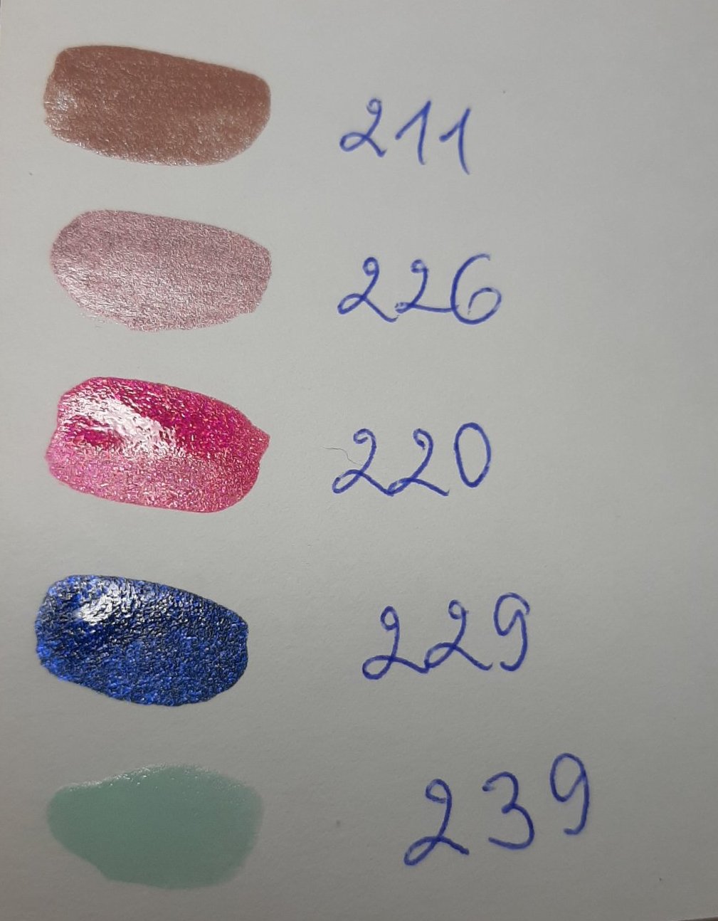 даже нямах желание да ги пробвам, но сега като писа ги мацнах на едно листче. Наистина синьото е синьо, а в цикламеното не си личи много лилавия шимър, ще ги видя и на дневна светлина. Исках да взема и червения брокат, той обаче свършил.
